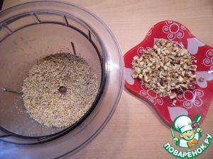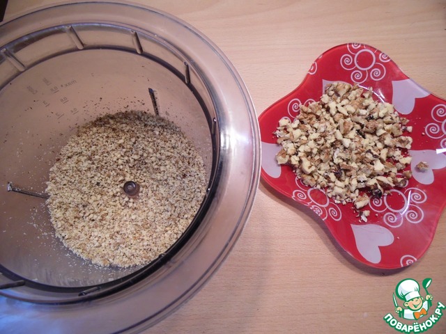 Грецкие орехи разделить на 2 части. Первую крупно порубить, вторую измельчить в крошку.