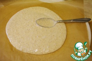 Наливаю в центр круга треть теста - оно будет растекаться, можно помочь ему немного ложкой, и сразу в разогретую до 180 градусов духовку на 15-20 минут. -