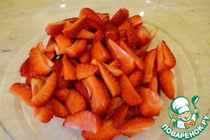 Пока коржи пекутся - займемся, так сказать, самим лесом! Для этого перебираем клубнику и режем самые красивые ягоды (где-то 1/3 всего объема) на вот такие дольки. Остальную клубничку режем просто ломтиками любой формы и величины. Хочу отдельно сказать, что клубнику для этого тортика надо брать без бочков, только первой свежести, по возможности не мятую!