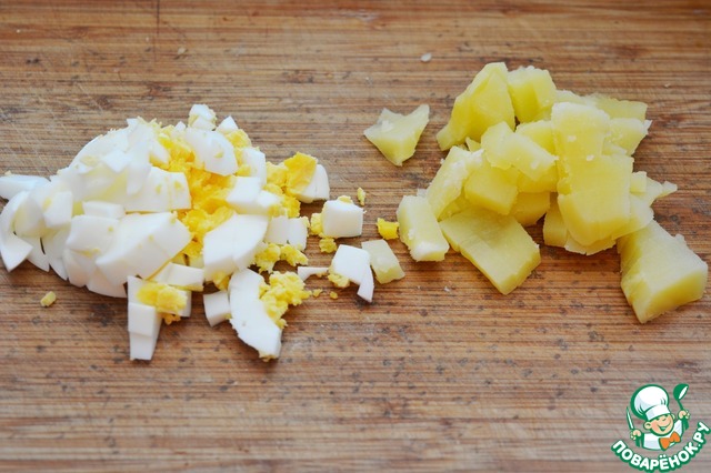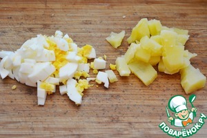 Картофель сварите в мундире, яйца отварите вкрутую, остудите их и нарежьте кубиками.