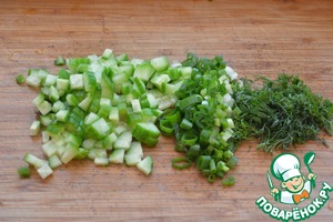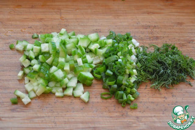 Также кубиками нарежьте свежий огурец, нарубите зеленый лук и укроп.