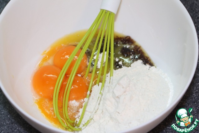Ввести муку и разрыхлитель. Снова хорошенько вымешать. -