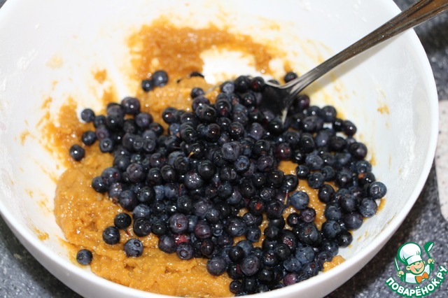 Добавить чернику, аккуратно размешать, чтобы не слишком мять ягодки.