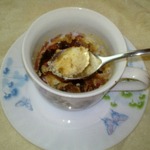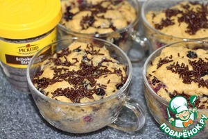Распределить тесто по чайным чашкам равномерно. Чашки должны бить стеклянные, глиняные или фарфоровые, ни в коем случае не берите чашки с золотистым ободочком.