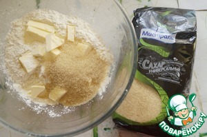 В чашу насыпать муку, добавить порубленное на кусочки сливочное масло, всыпать сахар и растереть в крошку при помощи рук.