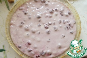 Достать из холодильника форму с песочным тестом и вылить поверх него тесто с вишней.