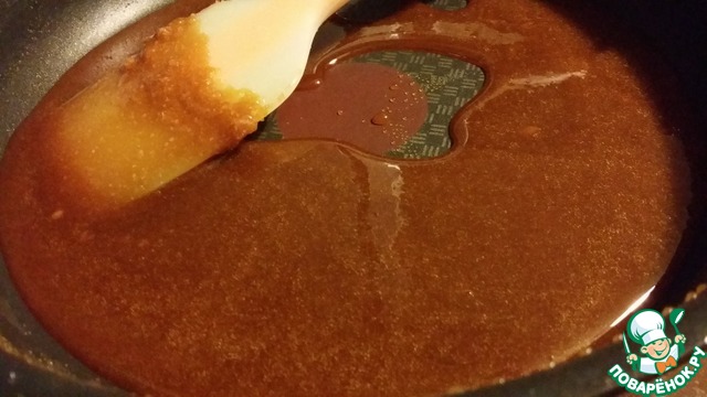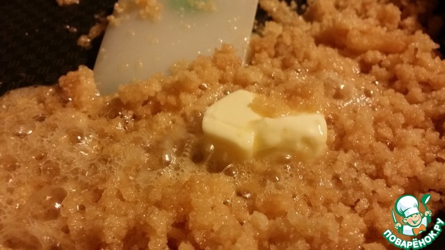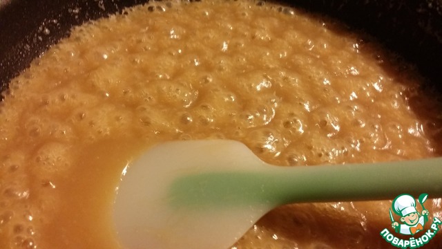 Небольшими кусочками ввести сливочное масло, размешивая каждый раз. Вообще считается, что карамель нужно варить в алюминиевой посуде, сахар не перемешивать до растворения и добавлять мелкими порциями, масло вводить только в расплавленный сахар и т. д. Я так пробовала, и у меня ничего не вышло, поэтому делаю, как описываю здесь. Масло важно взять хорошего качества, иначе есть риск испортить продукты. Итак, когда вводим масло, оно начинает "ругаться" с сахаром, шипеть, сахар собирается в комки. Через непродолжительное время при постоянном помешивании масса приобретает однородную консистенцию.