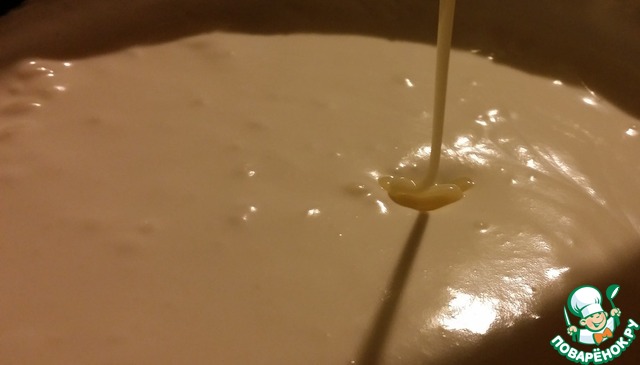 Тонкой струйкой, помешивая массу, влить горячие сливки. Добавить соль по вкусу. Проварить около 10 минут, постоянно помешивая. Вот такая штука в итоге получается. Она еще довольно жидкая, но при остывании загустеет.