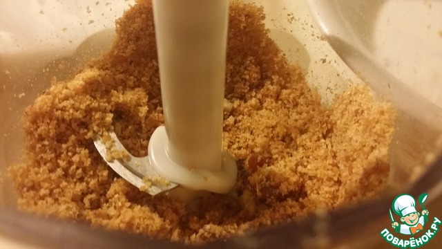 Остывшую массу отделить от фольги, поломать на кусочки. Половину засунуть в пакет и пройтись по нему несколько раз скалкой. Сильно мельчить не надо.