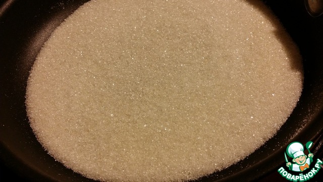 Карамельный соус сварить любым удобным для Вас способом. Я делаю так. На сухую сковороду выложить сахар. Прогреть его до легкого зарумянивания.