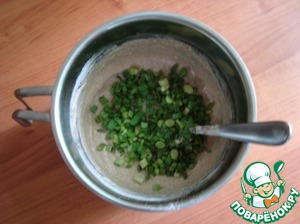 Вмешиваем муку по ложке. Тесто не совсем густое. Добавляем масло подсолнечное. Лук мелко рубим и выкладываем в тесто. Перемешиваем.