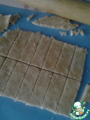 Тесто тонко раскатать, нарезать на продольные полоски.