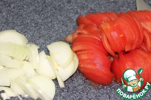 Помидоры обдать кипятком, затем холодной водой. Снять кожицу, мякоть порезать тонкими ломтиками. Чеснок и репчатый лук измельчить произвольно.