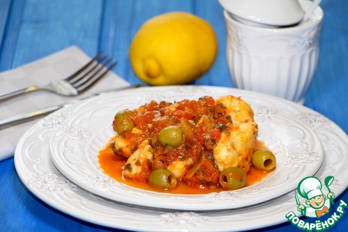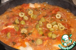 Положить в соус куски рыбы, добавить оливки, целые или порезанные колечками, или разрезанные пополам, как Вам больше нравится, по желанию добавить белый винный уксус. Тушить еще минут 7-8.