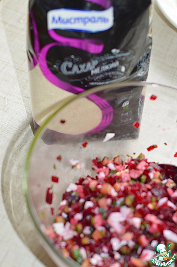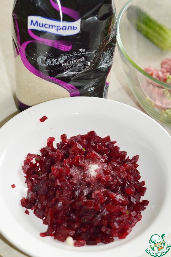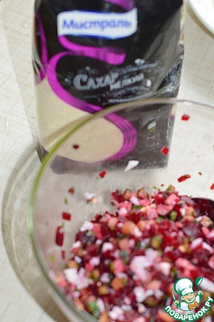 4. Свеклу остудить и нарезать мелкими кубиками, добавить сахар коричневый Мистраль и перемешать.
