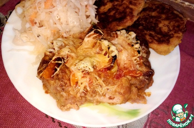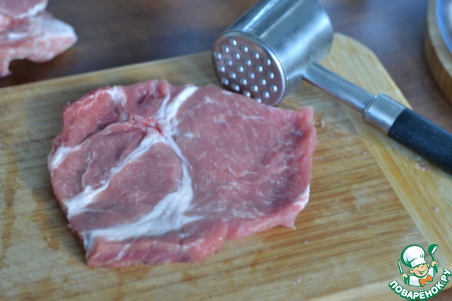 Нарезать свинину на отбивные, слегка отбить.