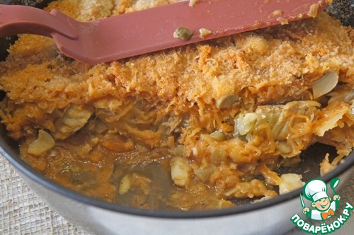 На дно смазанной маслом и посыпанной сухарями сковороды положить половину капусты, разровнять.