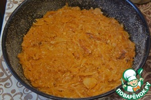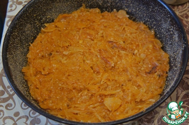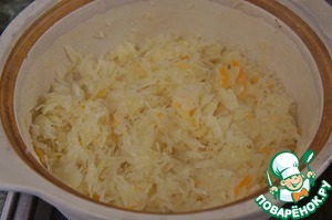 В кастрюле разогреть масло, положить капусту, добавить полстакана воды и тушить капусту до полуготовности.