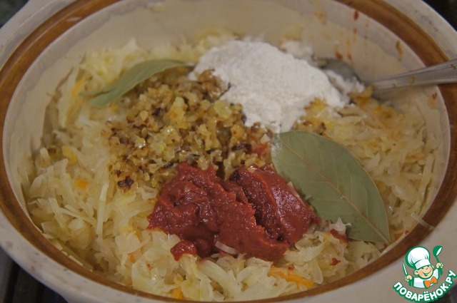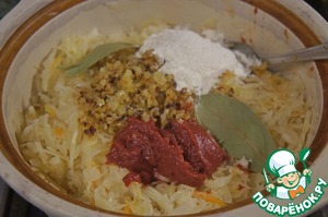 Добавить в капусту томат-пасту, сахар, муку и лук, посолить, поперчить и тушить практически до готовности.