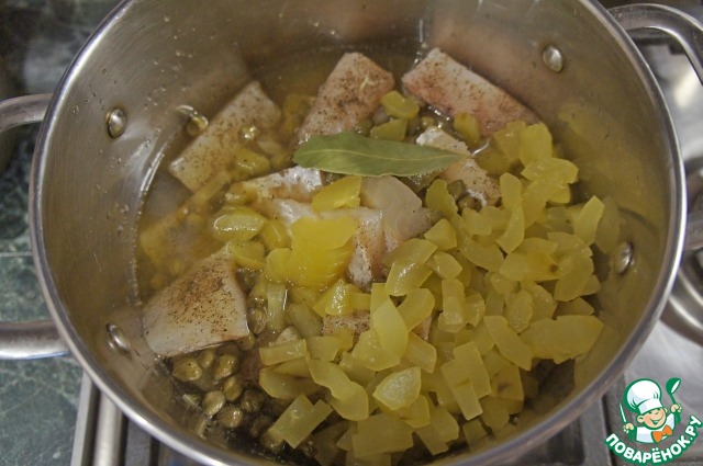 Пока капуста тушится, подготовить рыбу, нарезать её кусками по 40-50 г, сложить отдельно в кастрюлю, посолить, поперчить, добавить каперсы (если каперсов нет, не беда, можно обойтись и без них),