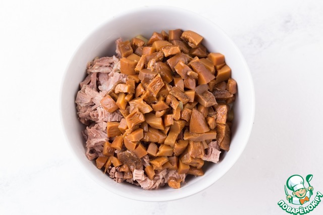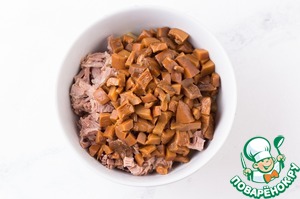 3. Грибы промыть от рассола и порезать мелким кубиком.