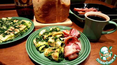 Для подачи свернуть кабачки в трубочку или просто выложить на тарелку. Подать к кабачкам вкусного хлеба или гренки.