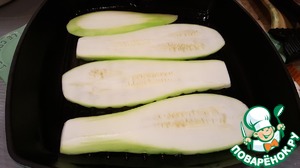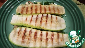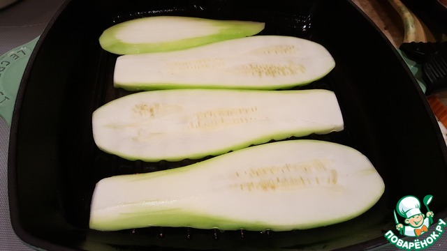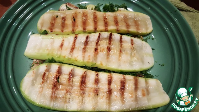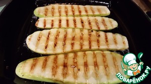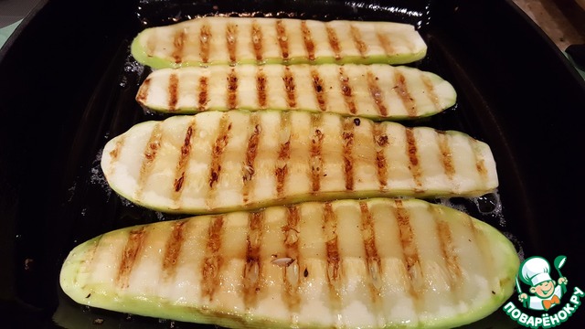 Нагреть сковороду гриль и смазать её небольшим количеством масла. Обжарить кабачок с одной стороны. -