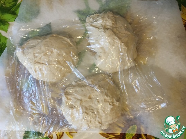 Достаём наше тесто из холодильника и делим его на 3 части, даём тесту согреться под пленкой при комнатной температуре 1 час.