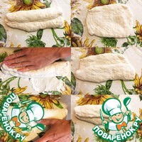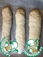 Далее начинаем формировать багеты стандартным способом. Тесто липнет сильно, поэтому минимально присылаем мукой поверхность, главное, не переусердствовать. Формируем из лепешки прямоугольничек, складываем одну сторону, потом другую, делаем ложбинку по центру, защипываем её, выкладываем багет швом вниз, руками придаём багету желаемую длину.