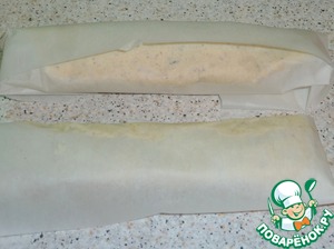 Половину теста выложить на вощеную бумагу, скатать "колбаску" грубой формы (тесто катается тяжело, оно слишком мягкое и вязкое) длиной приблизительно 18 см, диаметром 3 см.