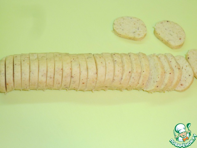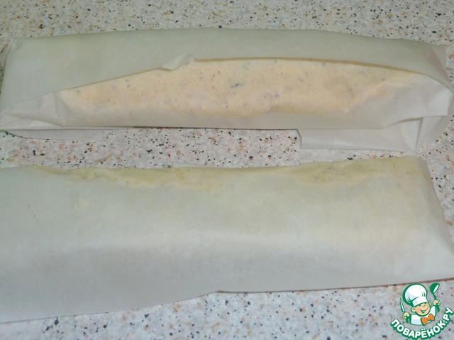 Процедуру повторить со второй половиной теста. Охлаждать «колбаски» в холодильнике не менее часа. Затем "колбаски" покатать еще по твердой поверхности, чтобы придать им более аккуратную цилиндрическую форму. Убрать в холодильник еще на два часа или на ночь. У меня лежали сутки. -