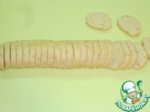 Достать одну из «колбасок», порезать ее ломтиками по 6 мм толщиной