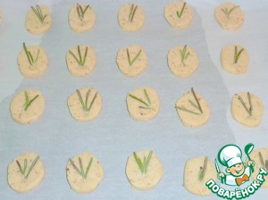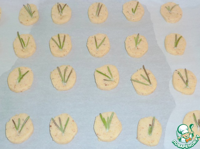 Каждую печенюшку украсить листиками свежего розмарина, мягко прижимая их к тесту.