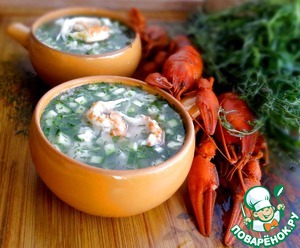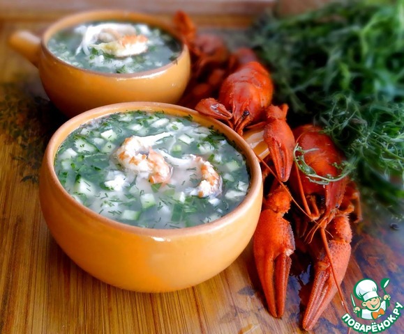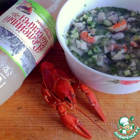 Очень легкая и освежающая окрошка. Никакой картошки и колбасы. Кроме того, сочетание отварной рыбы, эстрагона и резкого кваса, на мой взгляд, просто восхитительно. Не последнюю роль сыграют в этом блюде сладковатые раковые шейки.
