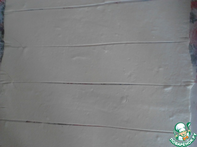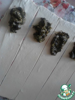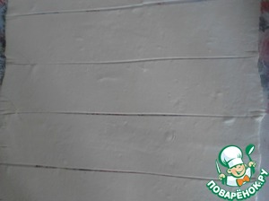 Слоеное тесто заранее разморозьте, немного раскатайте тесто и нарежьте на 6 полосок.