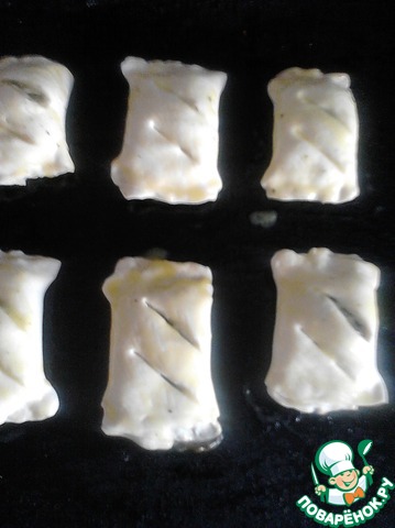 Рулетики выложите на смазанный маслом противень, слегка приплющите, делайте острым ножом 2 диагональные полоски.