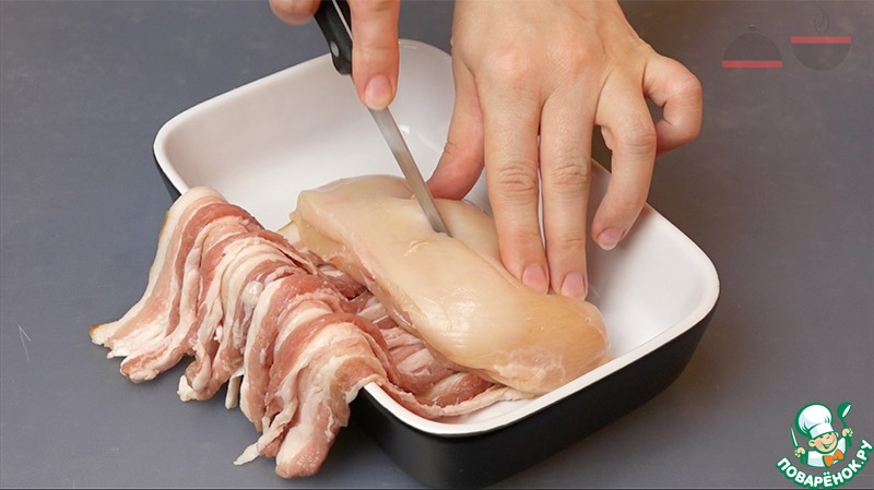 Выкладываем грудинку, нарезанную тонкими ломтиками, затем куриную грудку. Делаем разрез. Накладываем соус песто. Я использовала тот, который делала сама.