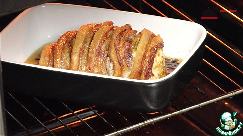 Затираем сыром. И заворачиваем краешки грудинки. Получается рулетик.
