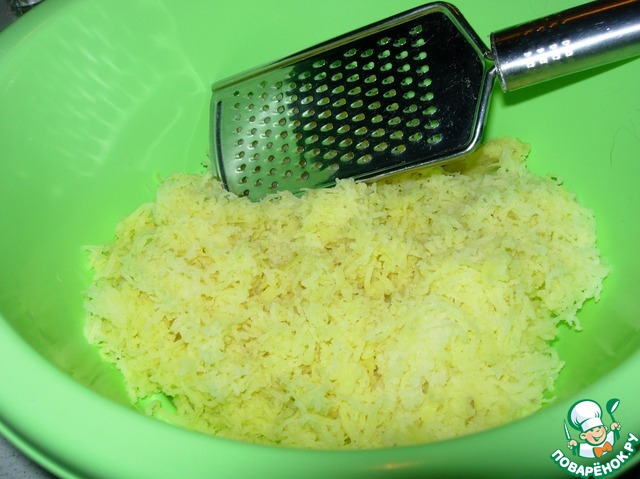 Итак, приступаем. Остывший отварной картофель пропускаем через мелкую решетку мясорубки (у меня картофель вчерашний, поэтому я его натерла на мелкой терке).