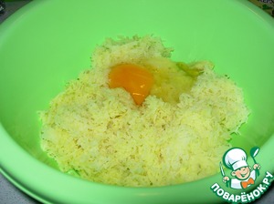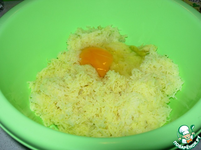 Смешиваем картофельное пюре с яйцом и творогом. Если ваш творог крупинками, можно вместе с картофелем его пропустить через мясорубку.