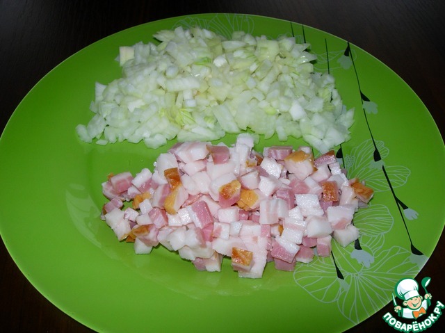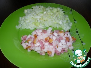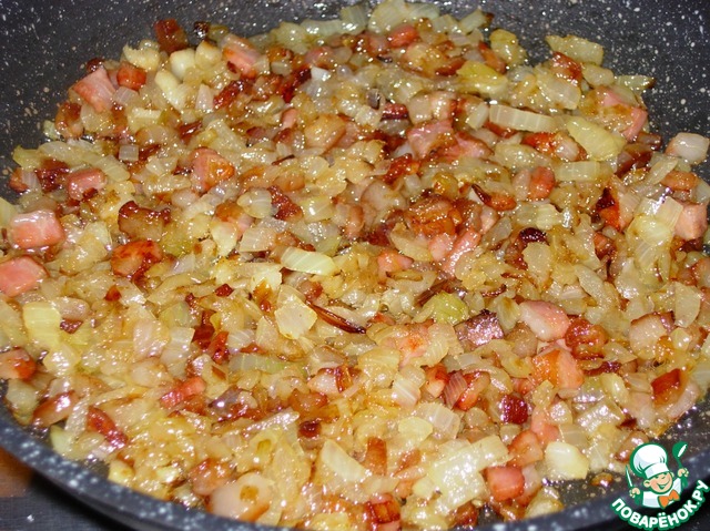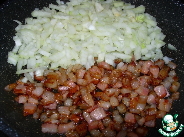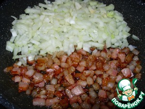 Обжариваем бекон до легкой румяности, добавляем лук и обжариваем до золотистого цвета.