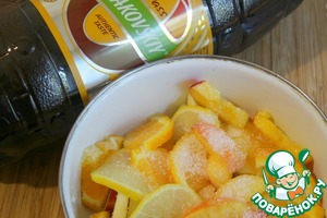 Сложить все фрукты и цитрусовые в емкость и посыпать сахаром.