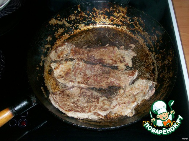 Затем обжариваем мясо на сухой раскаленной сковороде на максимальном нагреве, примерно по 1-2 мин с каждой стороны. Кусок мяса, брошенный на раскаленную сковороду сначала прилипает к нему, а когда его свободно можно сдвинуть - пора переворачивать.