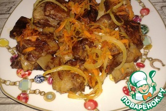 Итак, собираем наше блюдо: в кастрюльку укладываем слой лука и нарезанных грибов, на него - мясо, снова - грибы, лук, мясо. Так до конца. Верхний слой - лук.