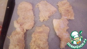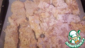 Обваливается рыбка в сырной смеси, а затем в сухарях. У меня сухарей было совсем не много, поэтому пришлось растягивать. Но лучше не экономить. Смазываем противень маслом и укладываем рыбку, затем сверху тоже поливаем маслом.