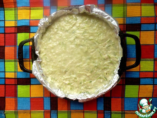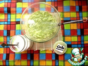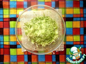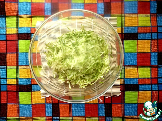 Кабачок натираем на крупной тёрке. Кожицу можно удалить, тогда кабачок в пироге станет абсолютно неуловимым. Но меня очень радует зеленоватый цвет мякиша, поэтому я этого не делаю :D