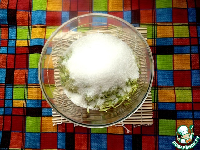 Вливаем в кабачок растительное масло и засыпаем сахаром. Ждём минуточку, чтобы кабачок дал сок.