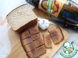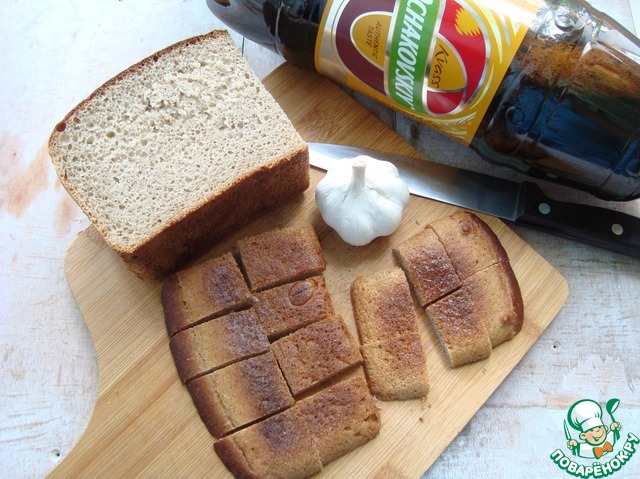 Только что сделанные сухарики натираем дольками чеснока почищенного.