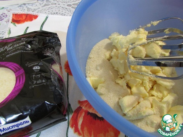 • В отдельной миске взбить сахар Мистраль Мелкий тростниковый нерафинированный и размягченное сливочное масло.