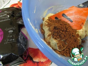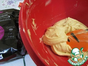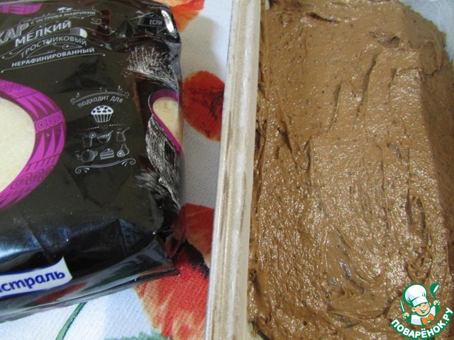 • Форму для выпечки смазать сливочным маслом. Присыпать мукой. Стряхнуть лишнюю муку. Выложить первый слой - шоколадный.